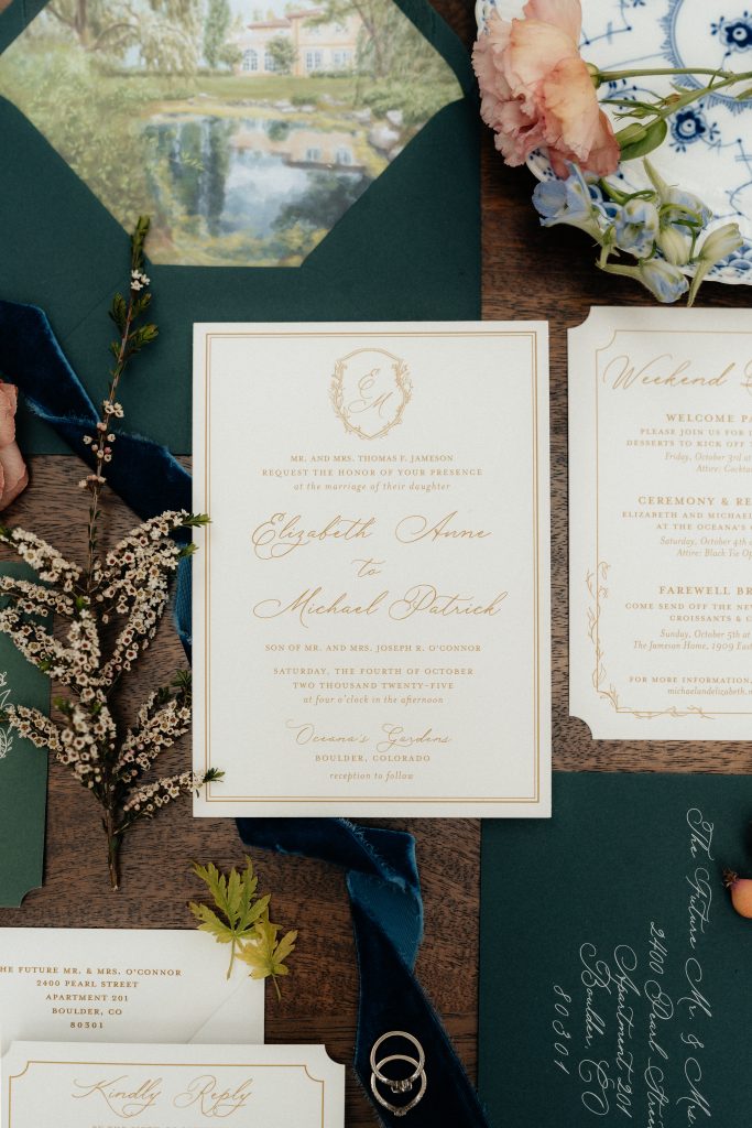 Talk about dreamy! Our styled shoot at Oceana’s Gardens in beautiful Boulder was one for the books. With planning and design curated by Enjoué Studio Events, this gorgeous shoot came together perfectly. Colorado Party Rentals provided stunning decor accentuated by thoughtful floral arrangements by Jackrabbit Floral & Design, as well as the picture perfect cake by Petite Petal Cakes. Elevated Spirits Colorado provided exceptional bartending while crafting amazing cocktails. Beautiful styling was provided by Denver Wedding Dresser, expertly styling bridal gown by Guillermo Pharis, veil by Veil Trends Couture, and jewelry from John Atencio. Brite Beauty did our bride’s hair and makeup perfectly. Our talented wedding pet attendant, The Pawfect Plus One, was there to keep our adorable dog models comfortable and happy throughout the shoot. Last, but certainly not least, the beautiful stationary was created by Alexis Jones Designs.