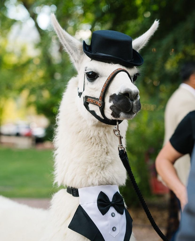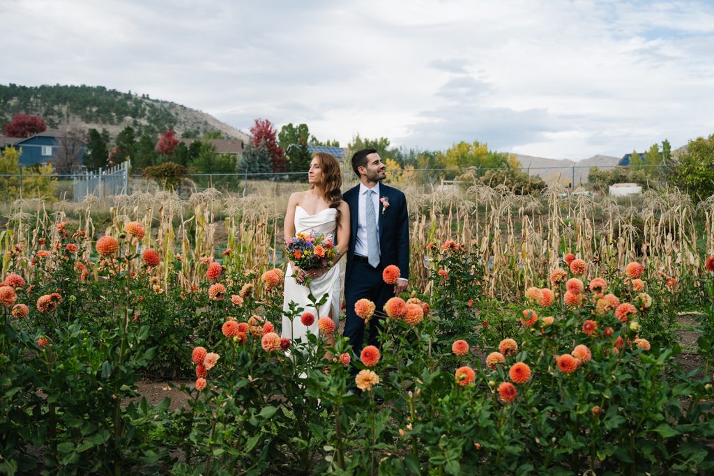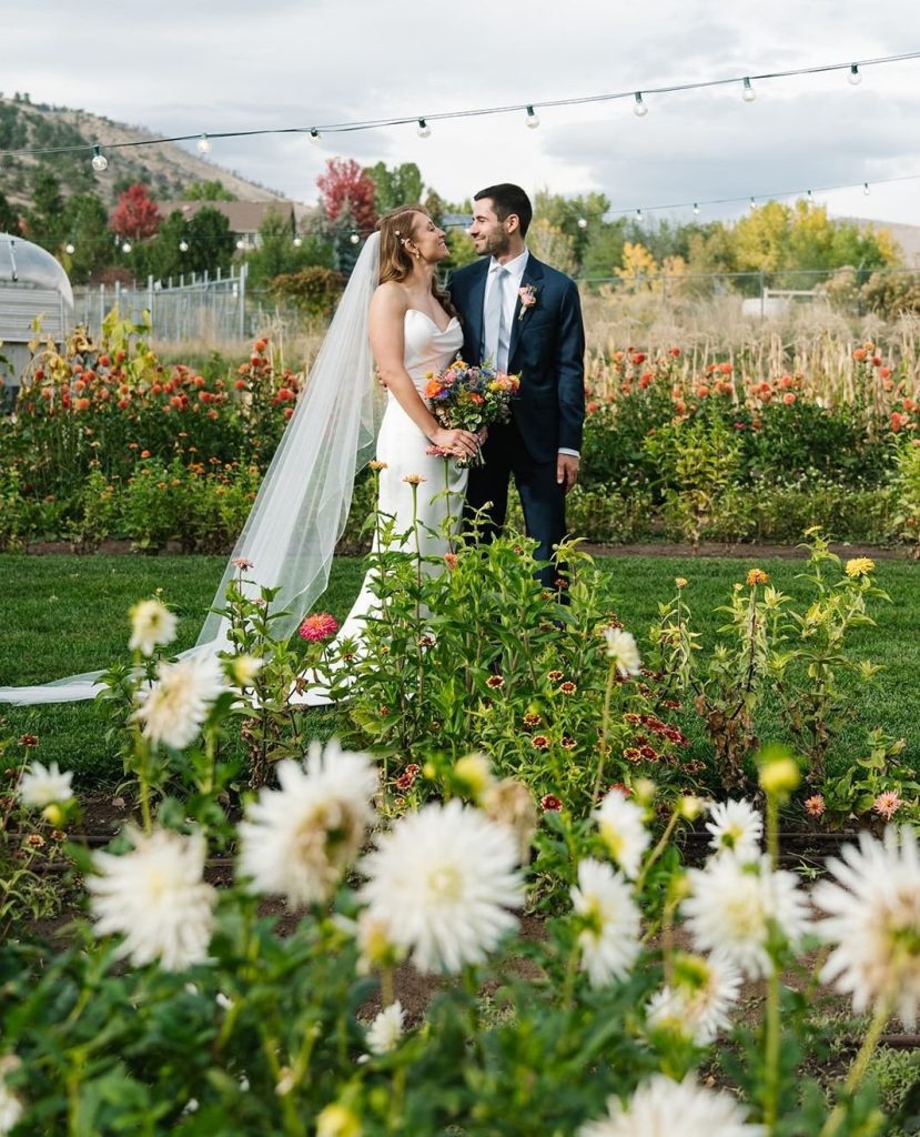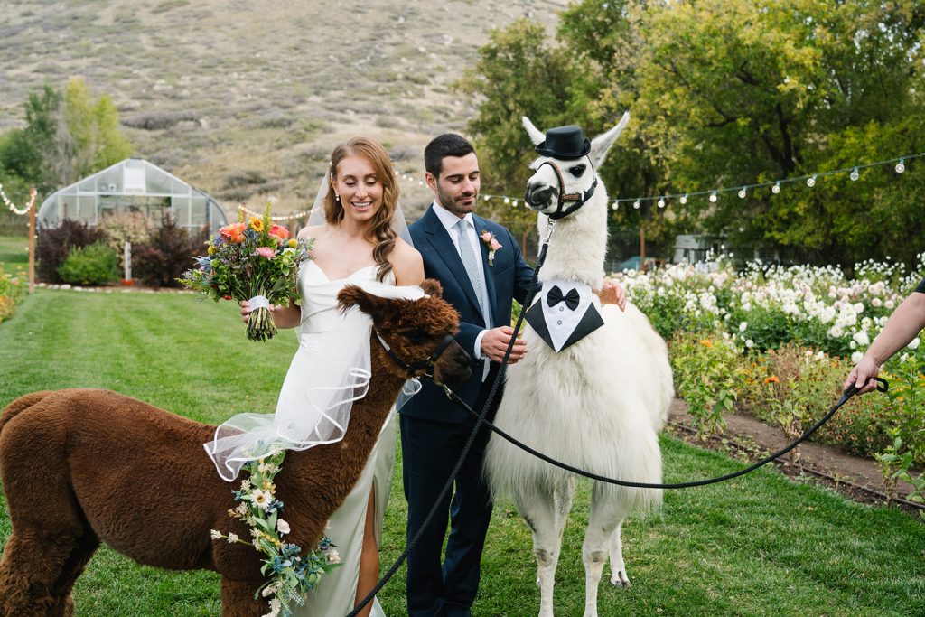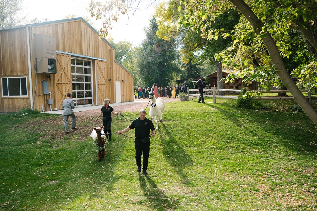 Kaylee and Adam had an October wedding at the charming Lyons Farmette where they enjoyed the abundant natural beauty of Lyons with the intimate seclusion of their venue. The couple’s ceremony was held under the large ceremony tree. In lieu of a flower girl, they opted to have two of their close friends be their flower men while live music played. During their cocktail hour, adorable alpacas from Sunrise Silhouettes delighted their guests and even posed with Kaylee and Adam in the flower field.