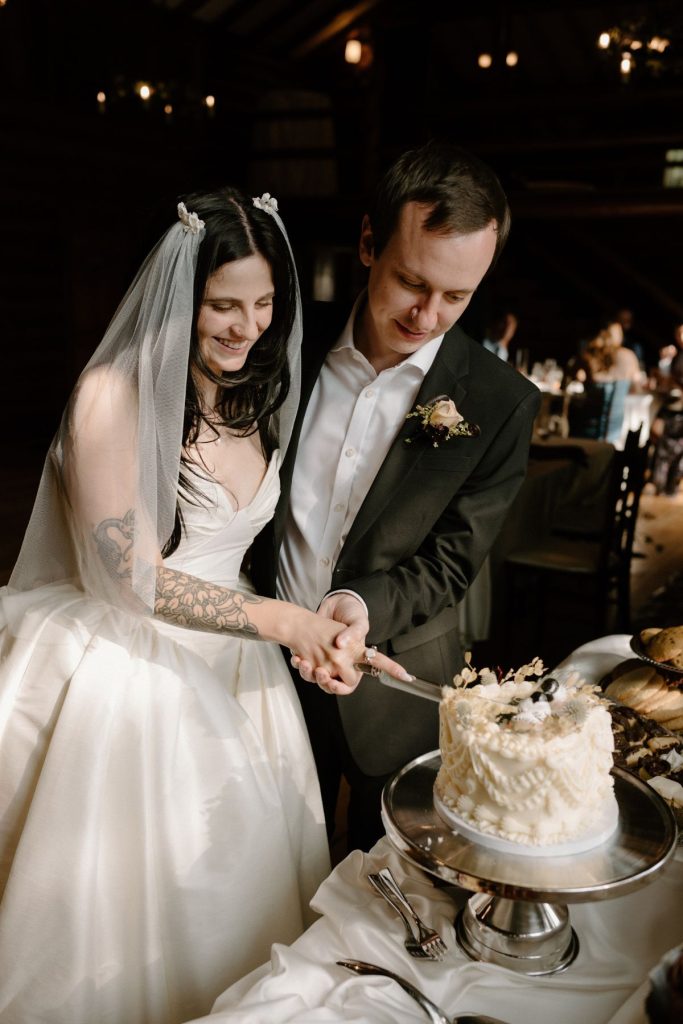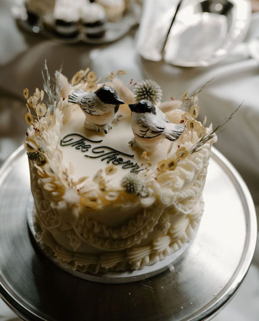 After their ceremony, the wedding moved indoors for an intimate, moody reception. The couple’s cake was decorated with decadent, textured frosting and topped with two birds lovingly carved by the bride’s grandfather.