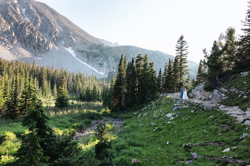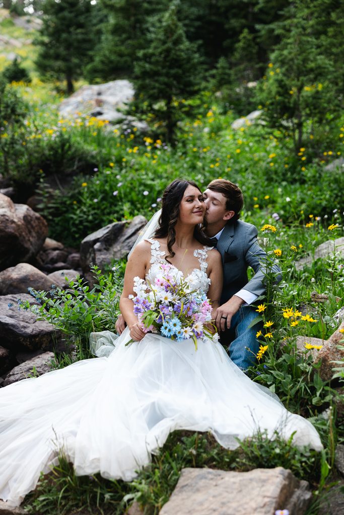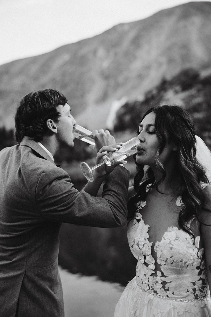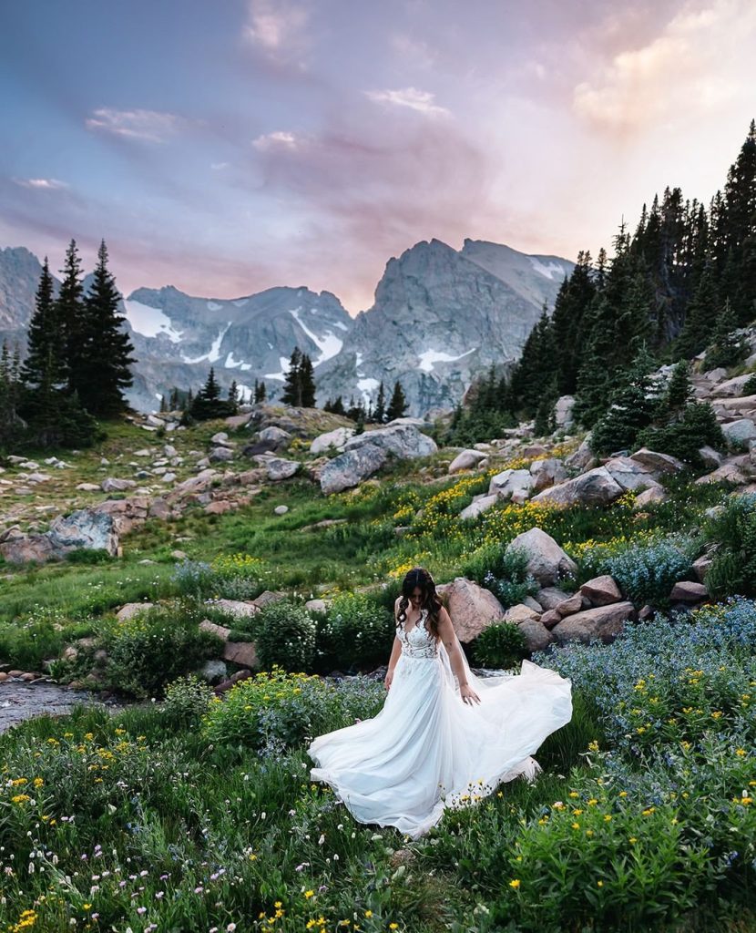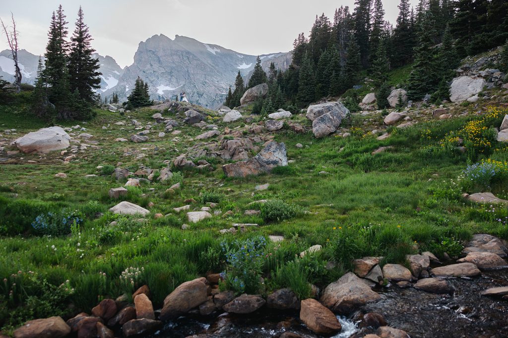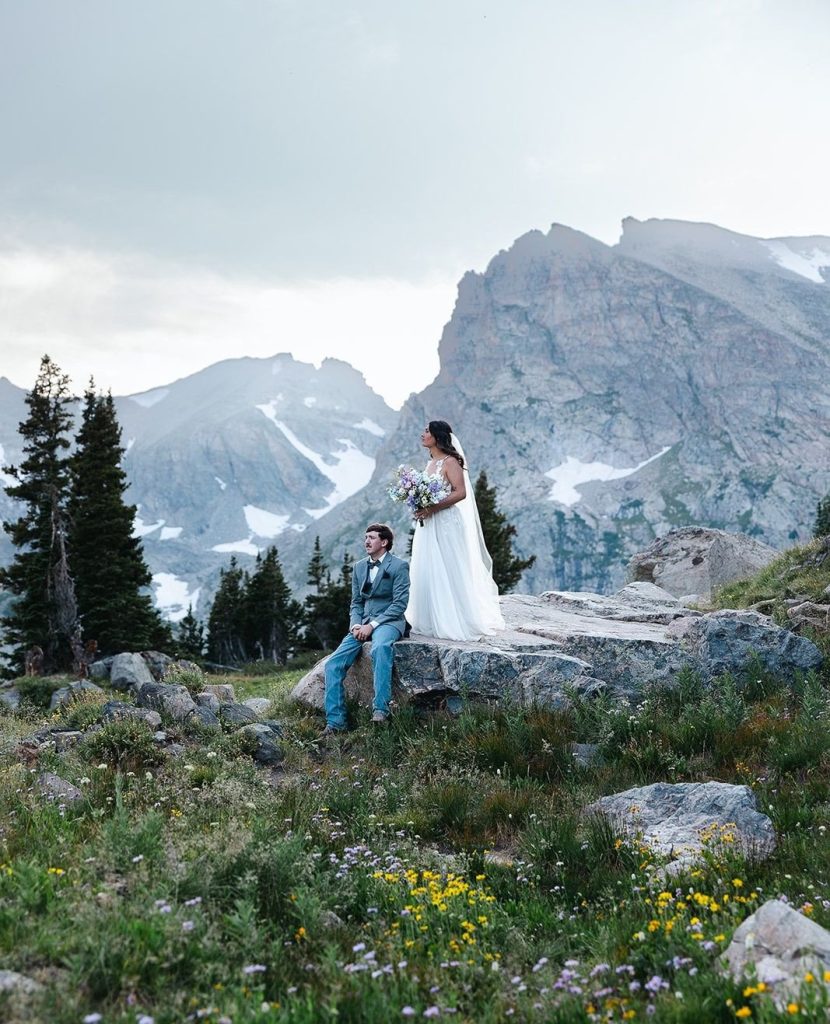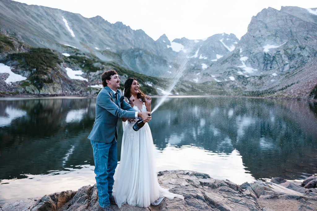 Keely and Bryce had an intimate ceremony with close family and friends at Brainard Lake before hiking to Lake Isabelle with just their adventurous photographer, NASFocus, along with them for beautiful sunset photos and a sweet picnic as newlyweds.⁠ As the sun dipped below the horizon, the two popped a bottle of champagne to toast their happily ever after before making the hike back down amongst the wildflowers.