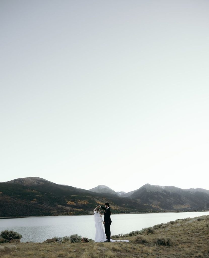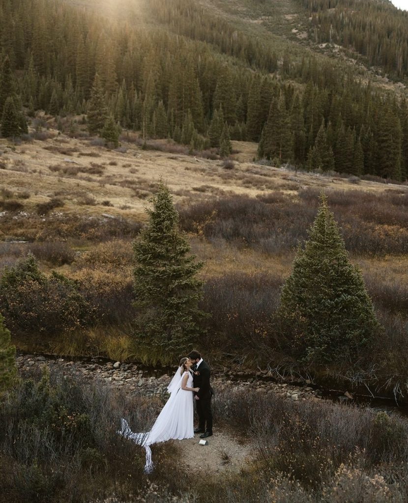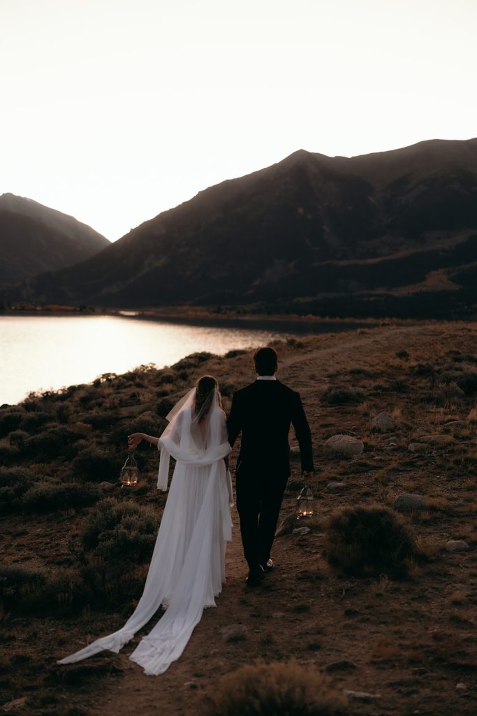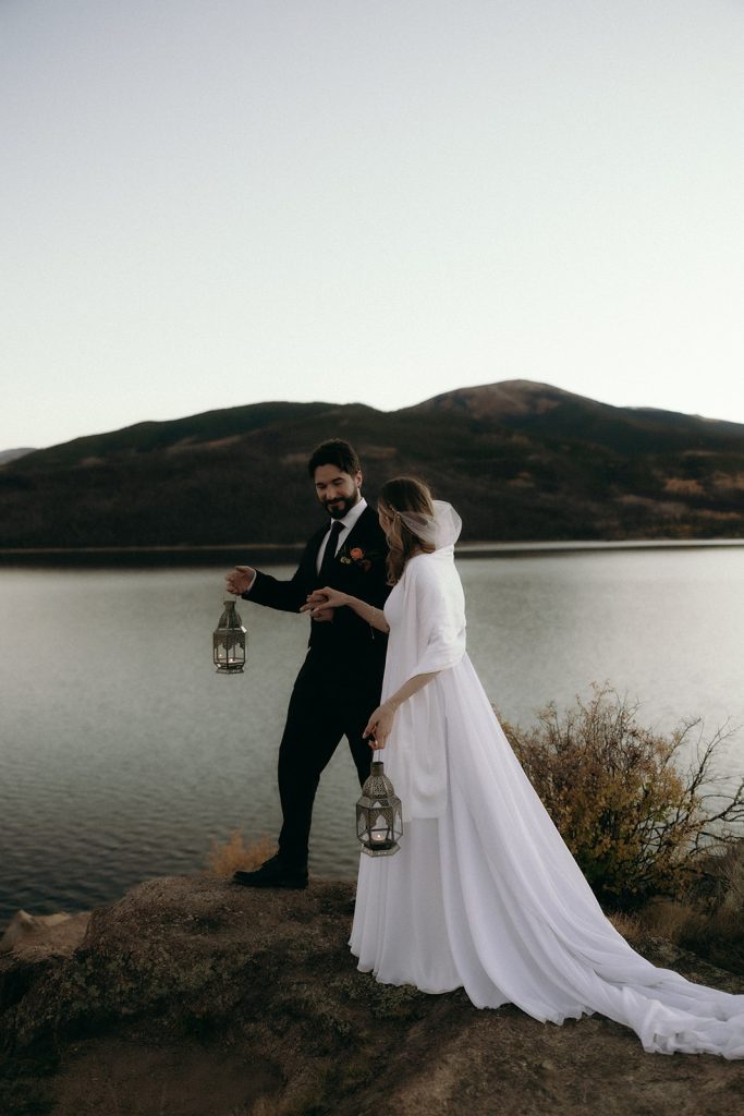 Lauren and Rainer eloped in Independence Pass near Aspen, Colorado, with only their photographer, Destiny Faith Photography, as witness. They started the day with sunny photos wandering the wooden bridges and trails throughs the high mountain forests, including a stop for portraits by the river. Their vows were exchanged in perfect serenity with the sun on the crest of the mountains, creating a hazy golden light as they exchanged rings and literally tied the knot! They rounded out their elopement day with a cake and champagne by the lake followed by lantern portraits as the last of the day’s light faded into night.
