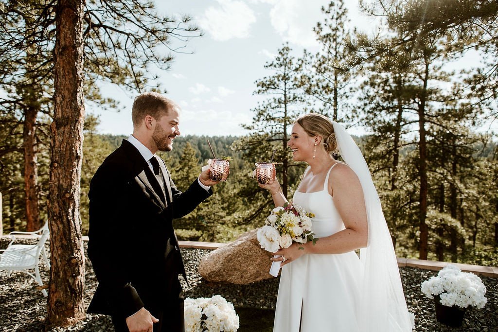 Maddie and Alex’s wedding in Sedalia had stunning views and the most beautiful, golden sunset! During their cocktail hour and reception, the couple enjoyed classic Moscow mules by Elevated Spirits Colorado, and ended their celebration in their venue’s indoor reception hall decorated with whites and golds for a beautiful country chic look.