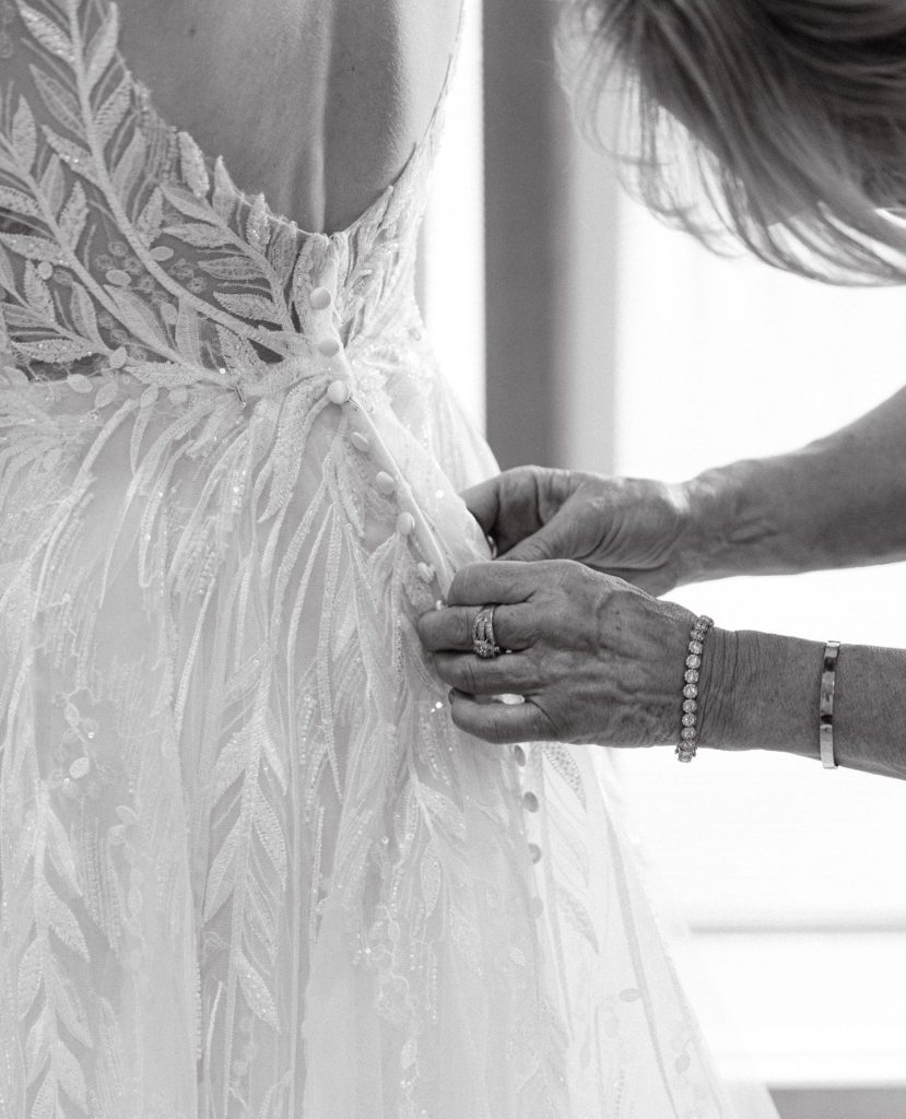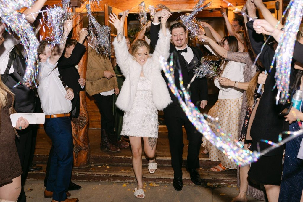 After their vows, they spent the rest of the evening soaking it all in with one another and celebrating on the dance floor with their friends and family—wearing heart shaped glasses of course. Before the night was over, Paige changed into her second look/party dress that was perfect for the dance floor. They ended the night running through a tunnel of streamers and Paige accessorized with a faux fur white coat to complete her party look! When asked what her favorite wedding memory was, Paige tells us, “My favorite wedding day memory was having our private moments before and after the ceremony. It was just the two of us taking time to really soak it all in. Our first look included private vows which helped us calm our nerves, be present with one another, and speak from the heart. After the ceremony we had a moment to sit down together and enjoy each other’s company before joining the cocktail hour.”