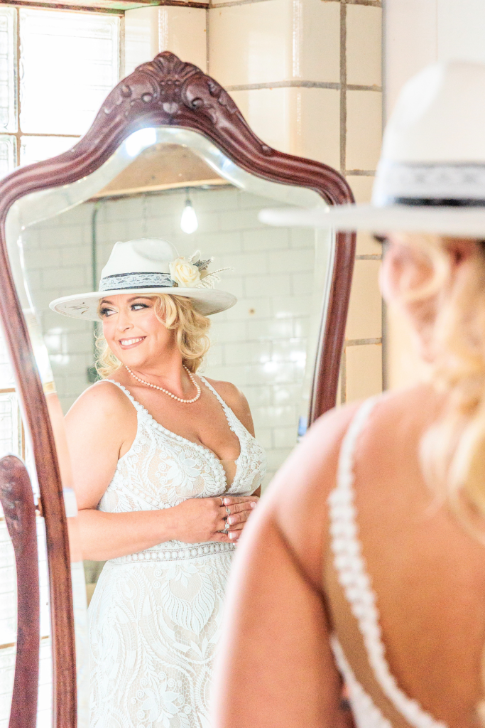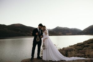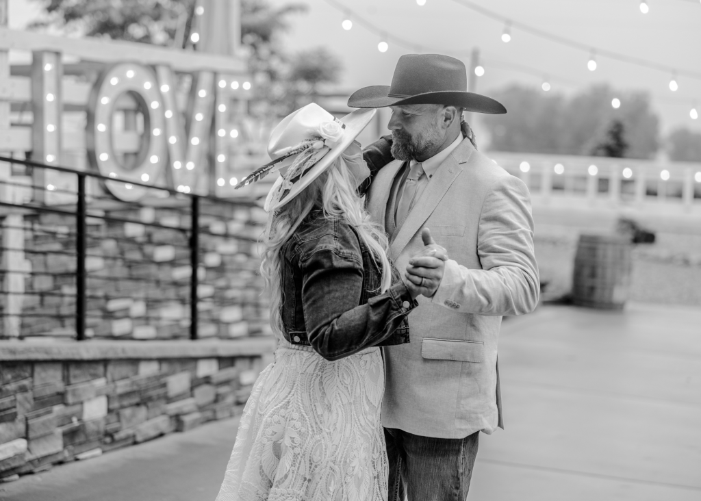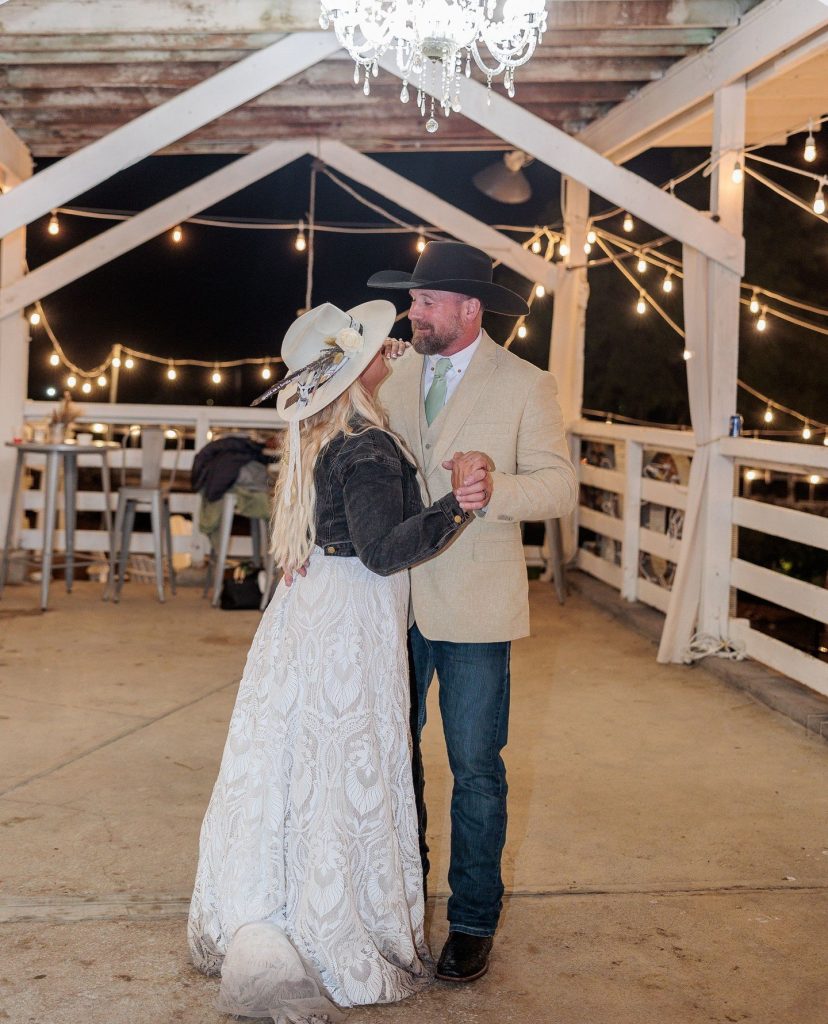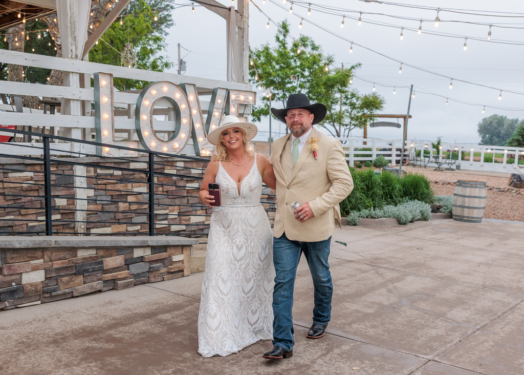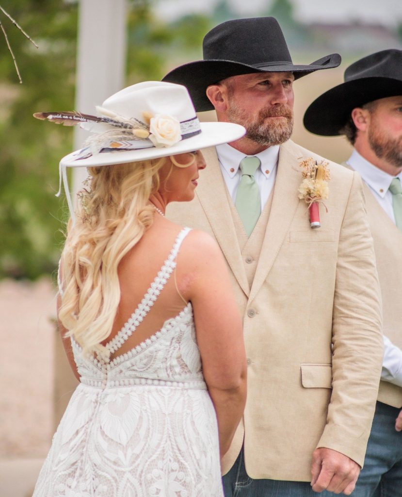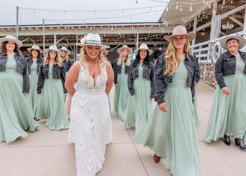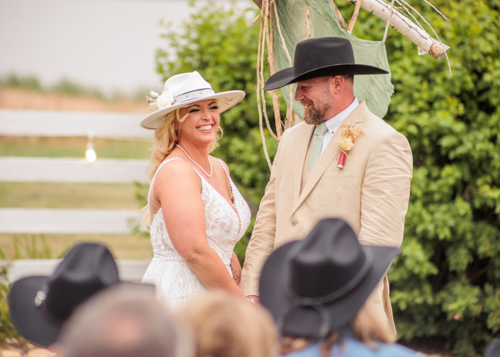 Shane and Josh had a beautiful, western wedding at the Rockin’ S Ranch in May. The day started with the two getting ready in the separate onsite suites with their loved ones. Shayne wore a delicate pearl necklace and had flowers woven into her hair, while she and all her bridesmaids wore western hats and cowgirl boots. Josh and his groomsmen wore black cowboy hats and boots as well, along with boutonnieres from bullet casings. Shayne then had a first look with her dad and brothers before her and Josh shared their private vows and a first touch beside the pond. Their following outdoor ceremony was full of happy tears and wide smiles.