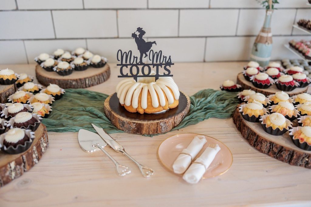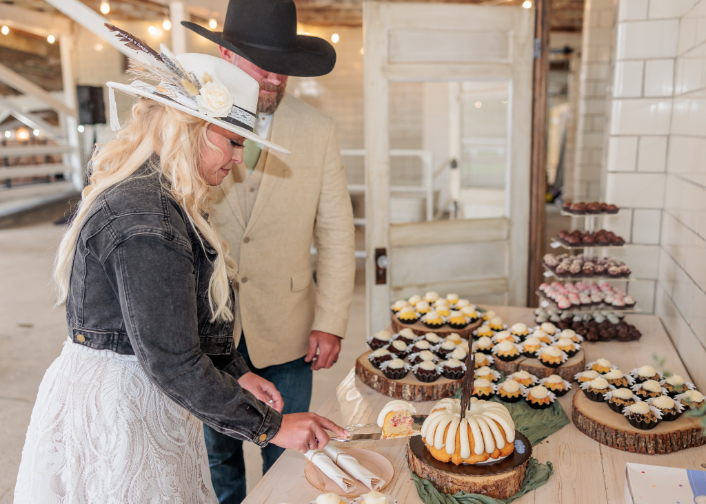 The celebration continued into the evening, with the reception held in the Rockin’ S Ranch’s open air barn. In lieu of a traditional cake, Shayne and Josh opted for a bundt cake and dessert table with cake pops. Sparkling fairy lights and chandeliers lit the space for a magical ambiance. At the end of the night, guests sent the happy couple off to a fun, LED light exit!