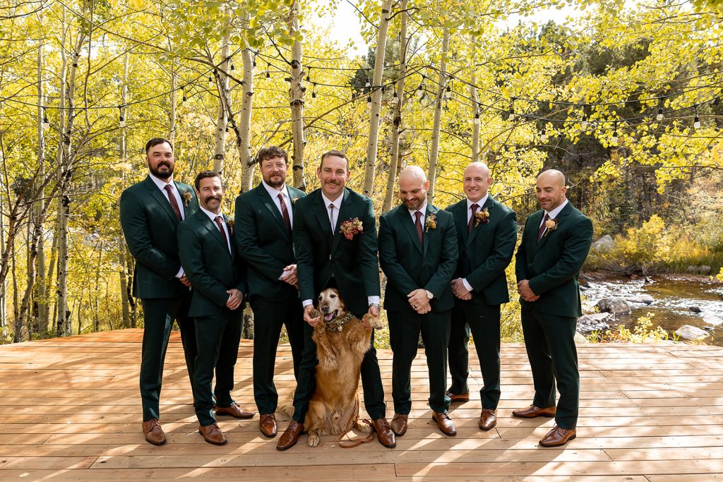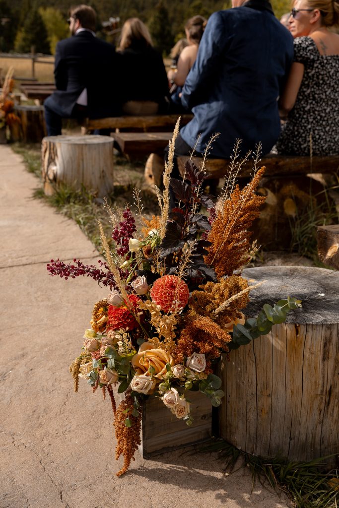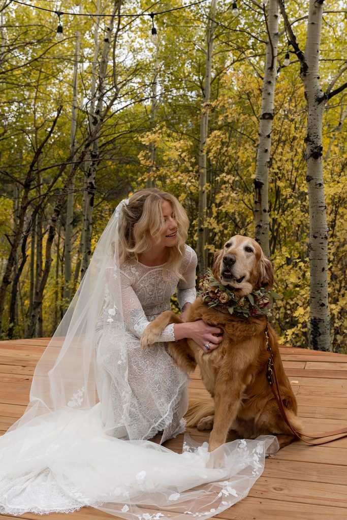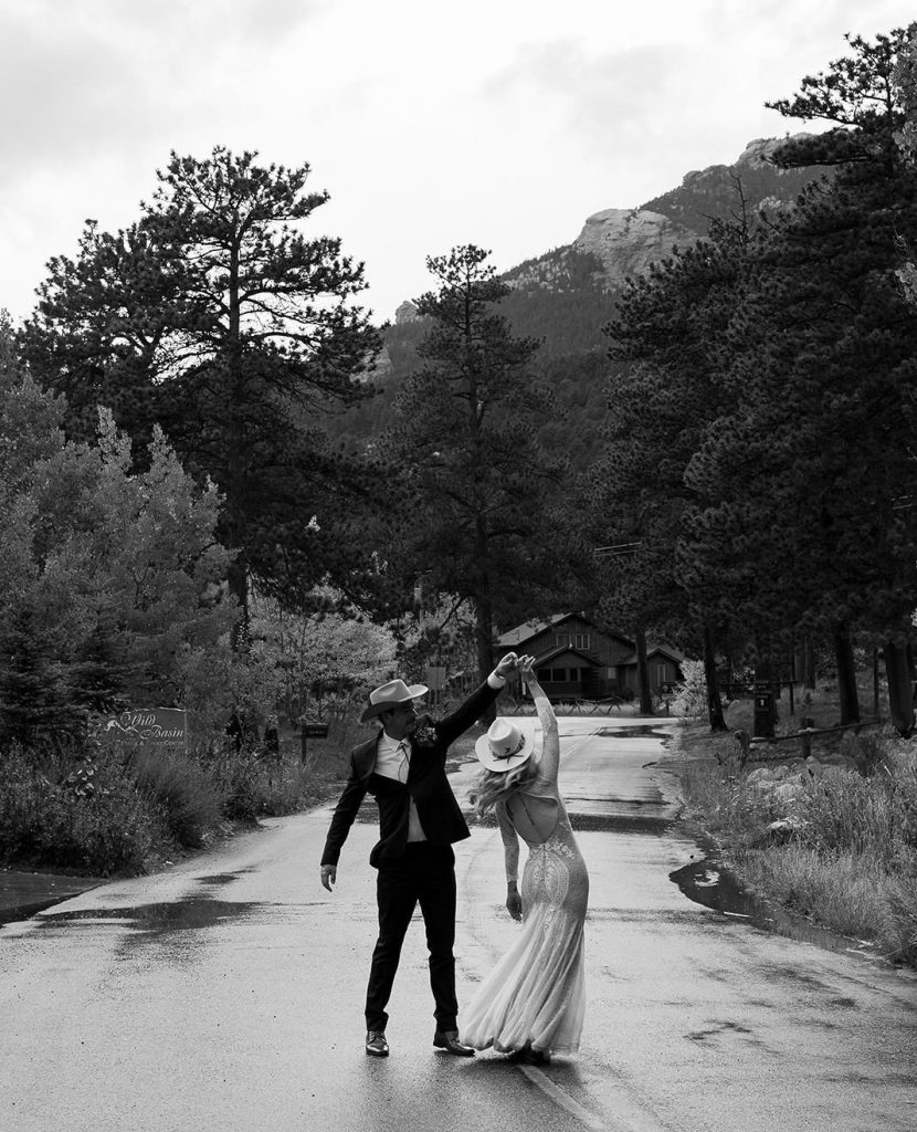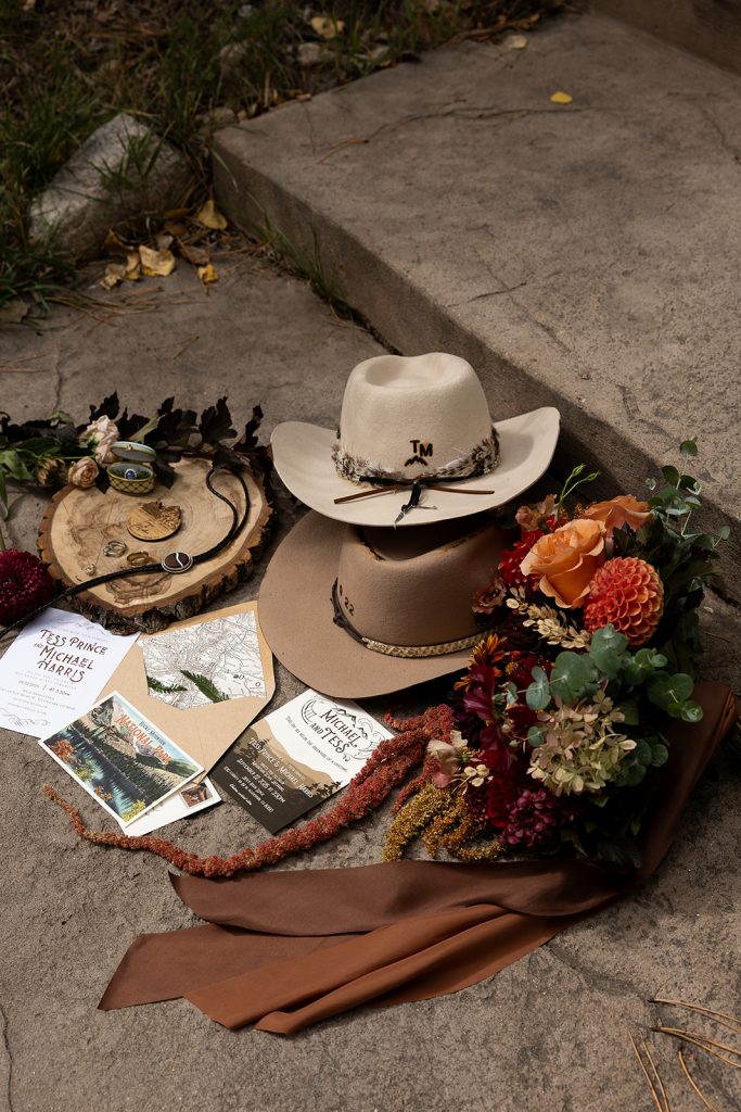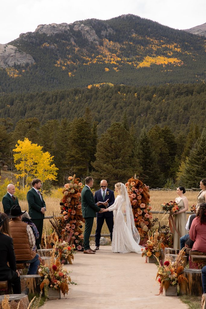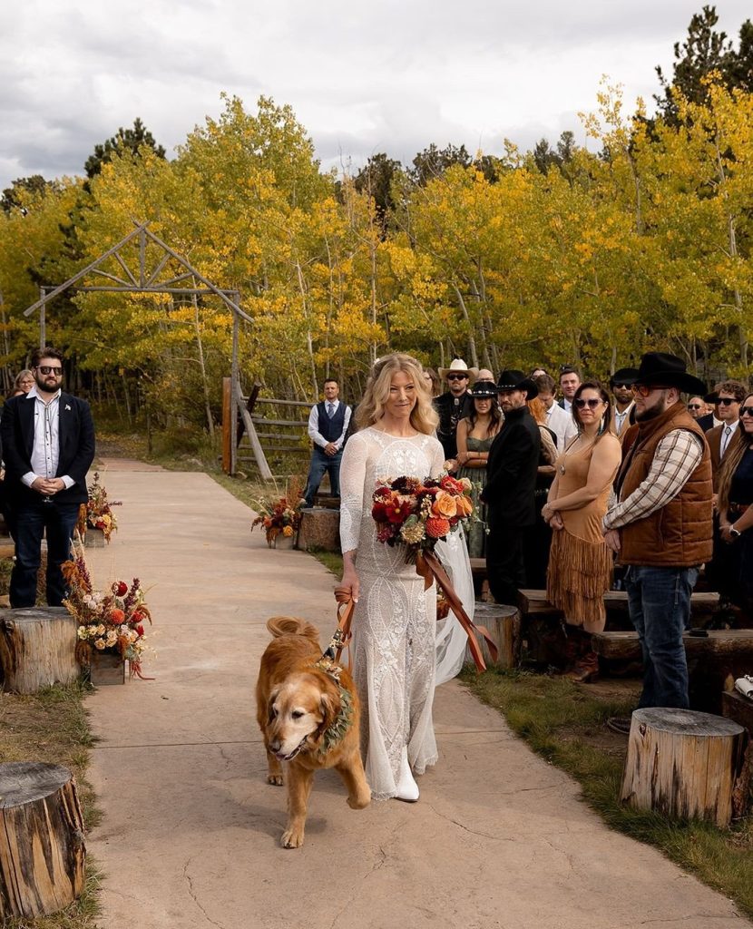 Exlpore Tess & Mike’s gorgeous wedding day in Allenspark, Colorado. Wild Blossoms Studio created the most stunning floral installations for their ceremony and reception, not to mention Tess’s beautiful bouquet and Mike’s incredible boutonnière. Their wedding day wouldn’t be complete without their lovable pup, who wore a flower collar and even walked Tess down the aisle at their outdoor ceremony. After their ceremony, the celebration flowed indoors for a fun cocktail hour with light rain showers outside. Fortunately, the rain didn’t last long and Tess and Mike were able to have their first dance back outdoors. The remainder of the reception was spent dancing the night away, visiting the custom hat bar, and having their grand exit to LED streamers.