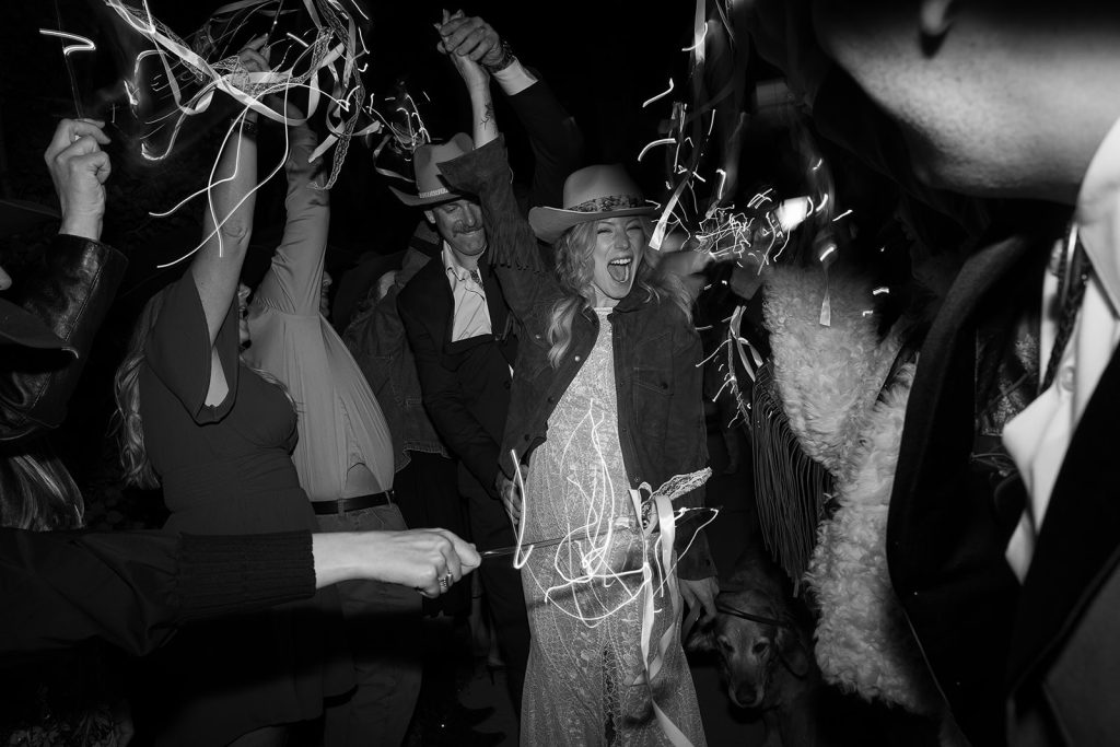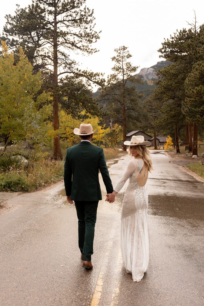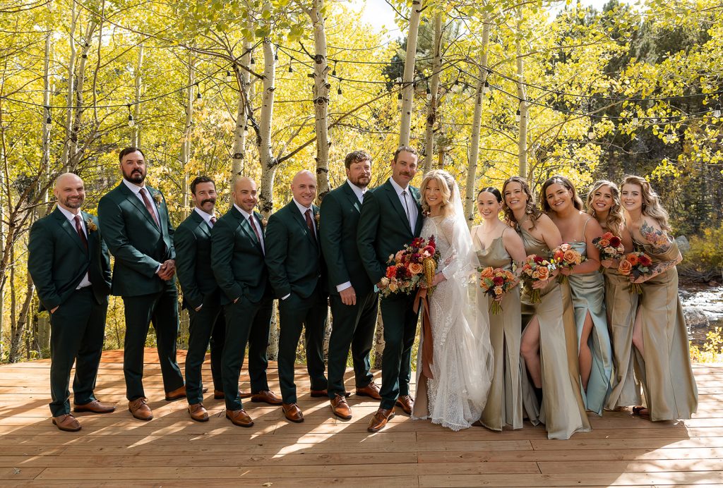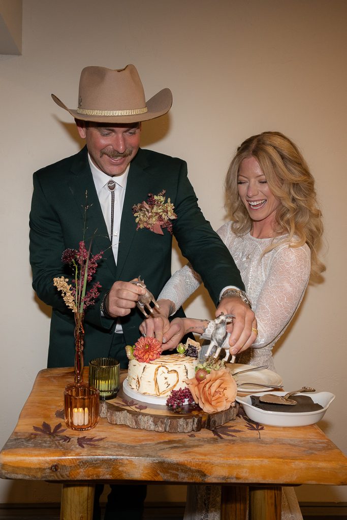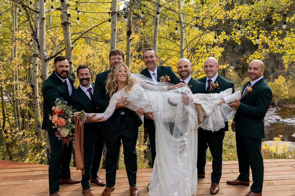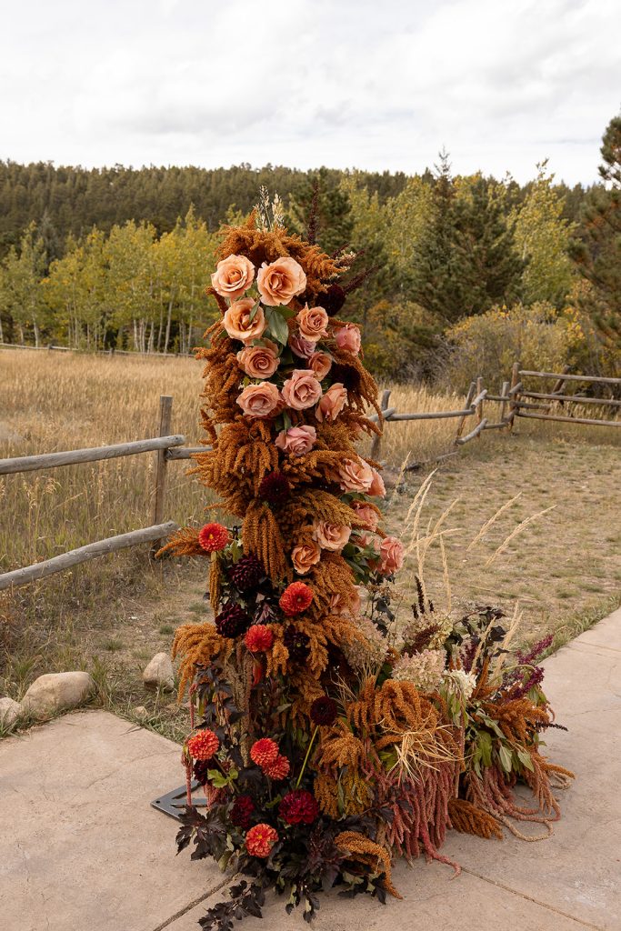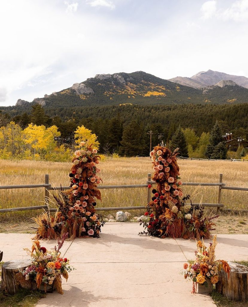 Exlpore Tess & Mike’s gorgeous wedding day in Allenspark, Colorado. Wild Blossoms Studio created the most stunning floral installations for their ceremony and reception, not to mention Tess’s beautiful bouquet and Mike’s incredible boutonnière. Their wedding day wouldn’t be complete without their lovable pup, who wore a flower collar and even walked Tess down the aisle at their outdoor ceremony. After their ceremony, the celebration flowed indoors for a fun cocktail hour with light rain showers outside. Fortunately, the rain didn’t last long and Tess and Mike were able to have their first dance back outdoors. The remainder of the reception was spent dancing the night away, visiting the custom hat bar, and having their grand exit to LED streamers.